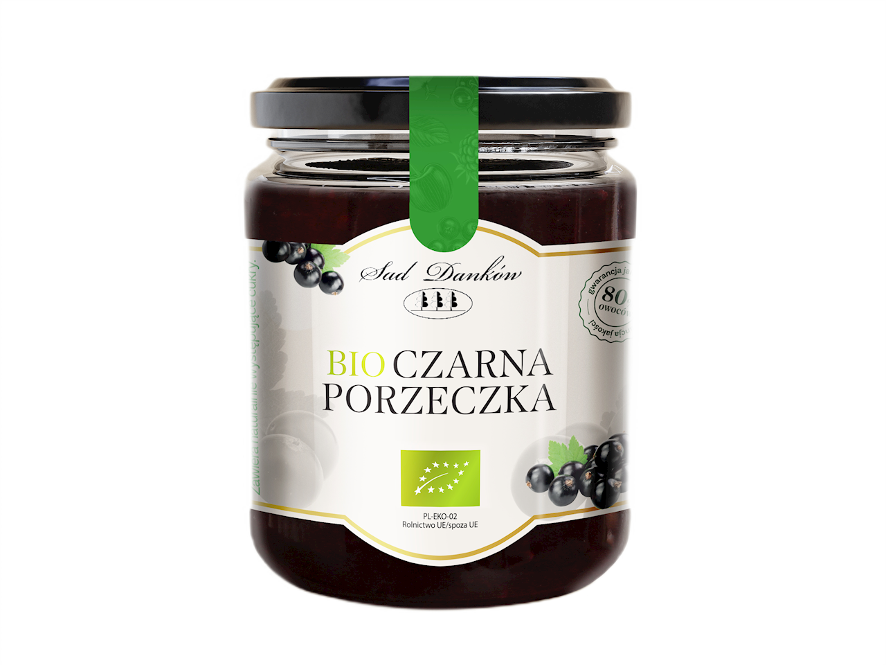 100 g produktu sporządzono z 80 g owoców. Ekologiczna czarna porzeczka, gotowana, pasteryzowana, bez dodanej wody.