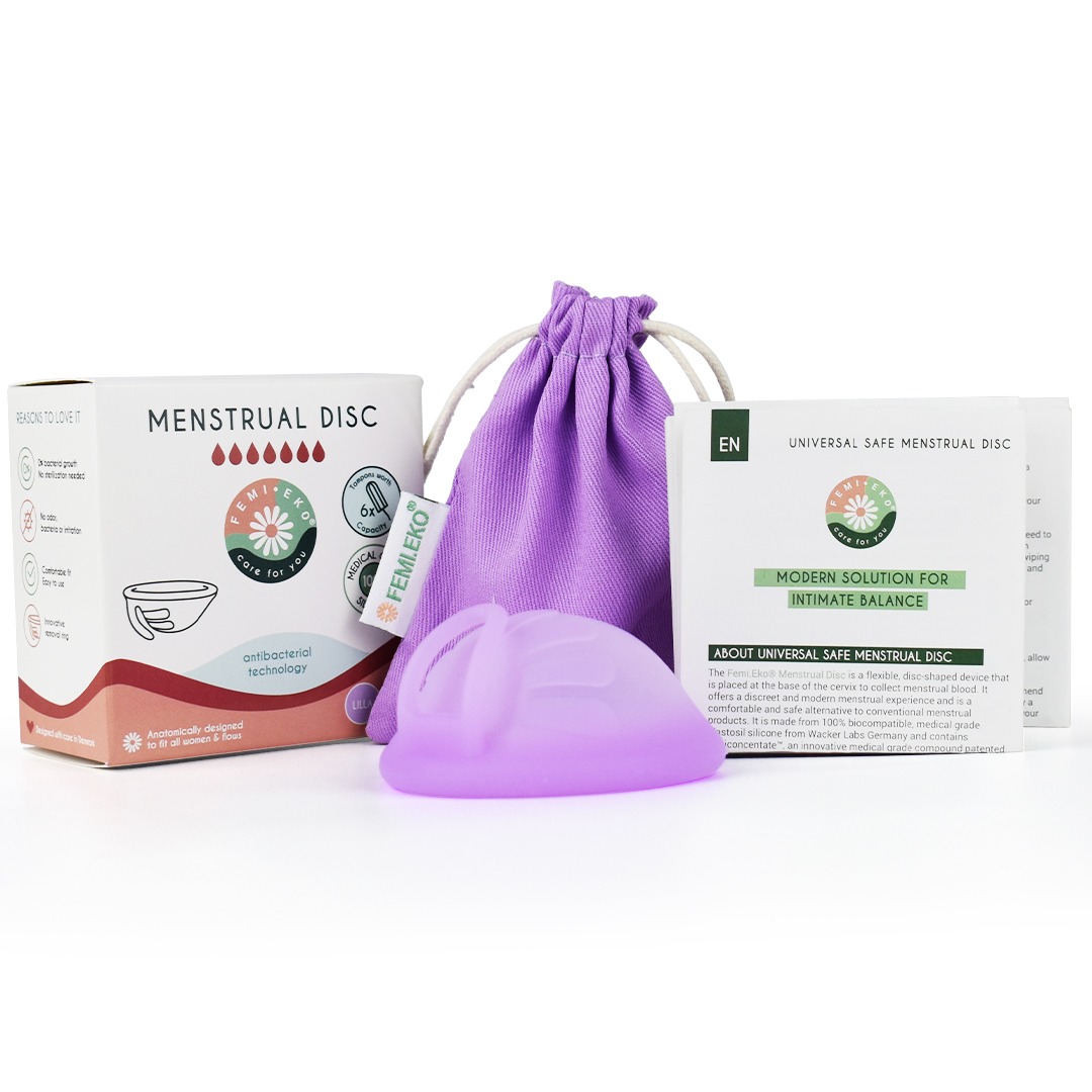 Bezpieczny, uniwersalny dysk menstruacyjny z Saniconcentate™ to innowacja Femi.Eko® zatwierdzona w Europie, która oprócz właściwości antybakteryjnych, posiada zintegrowany pierścień ułatwiający zdejmowanie i poprawiający komfort noszenia.