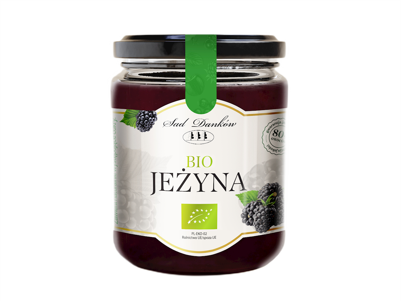 100 g produktu sporządzono z 80 g owoców. Produkt pasteryzowany otrzymany przez odszypułkowanie owoców jeżyny z dodatkiem koncentratu jabłkowego w celu otrzymania odpowiedniego poziomu pH