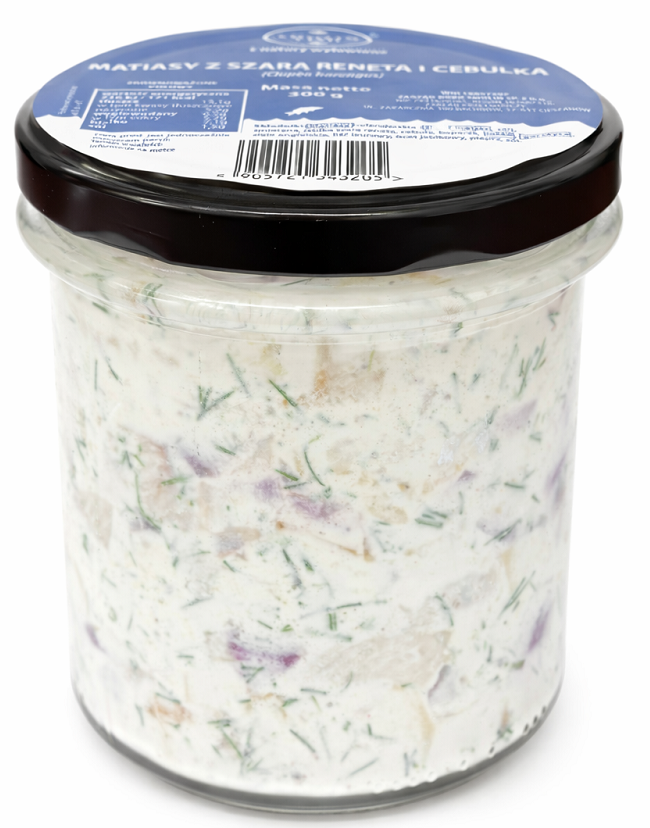 ŚLEDŹ atlantycki solony (Clupea harengus) (ŚLEDŹ atlantycki, sól) 38 %, ŚMIETANA, jabłko szara reneta 22 %, cebula 13 %, koperek, miód, GORCZYCA, ziele angielskie, liść laurowy, ocet jabłkowy, pieprz, sól.