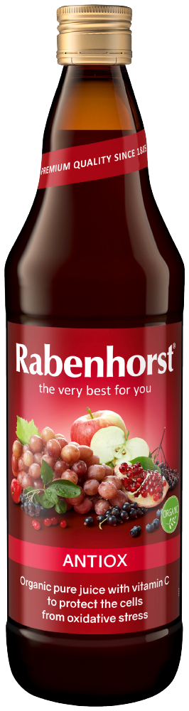 Sok bezpośrednio tłoczony NFC (nie z koncentratu) z czerwonych winogron, jabłek, czarnej porzeczki, aronii, (+ przecier z aceroli), z czarnego bzu, borówek, granatu i żurawiny.