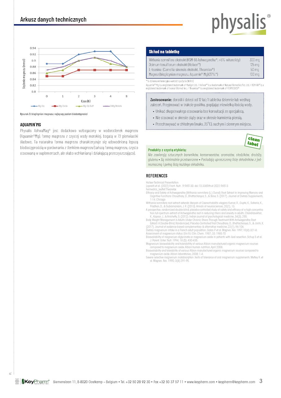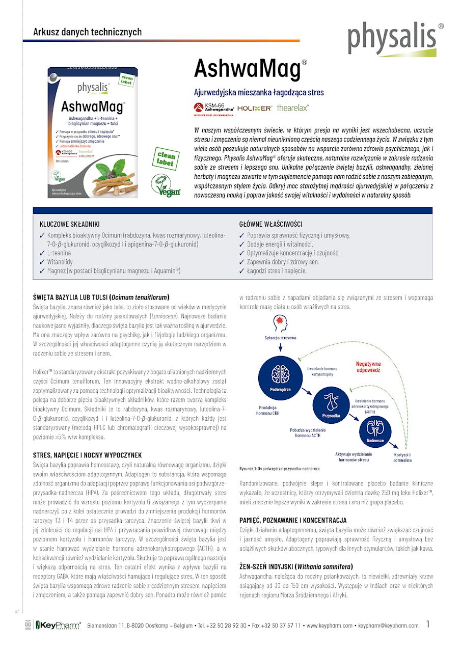 Physalis AshwaMag® łączy w sobie zalety dwóch roślin ajurwedyjskich, które mogą zapewnić naturalne wsparcie dla naszego często stresującego stylu życia. Ten zaawansowany kompleks zawiera KSM-66®, najwyższej jakości ekstrakt z ashwagandhy lub indyjskiego żeń-szenia o wysoce standaryzowanej zawartości witanolidów (5 %). Physalis AshwaMag® zawiera również innowacyjny ekstrakt z bazylii świętej lub tulsi (Ocimum tenuiflorum, Holixer™) z pięcioma bioaktywnymi związkami, które tworzą kompleks bioaktywny Ocimum. Bazylia święta i ashwagandha wspomagają w przypadku stresu i napięcia. Ashwagandha przyczynia się również do dobrego, zdrowego snu w nocy. Zawiera również Thearelax®, ekstrakt z zielonej herbaty standaryzowany na 40 % naturalnej L-teaniny. Wreszcie, ten kompleks zawiera dwie łatwo przyswajalne formy magnezu: bisglicynian magnezu i magnez morski z bogatej w minerały wody morskiej (Aquamin®Mg). Oba pomagają zmniejszyć zmęczenie.