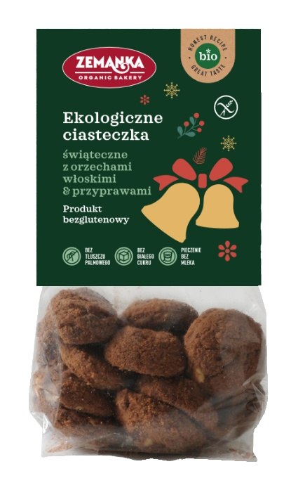 mąka gryczana*, nieutwardzony tłuszcz roślinny* (olej słonecznikowy*, tłuszcz kakaowy*, woda, emulgator: lecytyny (ze słonecznika*), regulator kwasowości: kwas cytrynowy), nierafinowany cukier trzcinowy*, JAJA*, mąka kukurydziana*, ciemna czekolada* (miazga kakaowa*, cukier trzcinowy*, tłuszcz kakaowy* - masa kakaowa min. 60 %, aromat waniliowy*), ORZECHY WŁOSKIE* 7,3 %, kakao*, aromat waniliowy*, mielony cynamon* 0,4 %, goździki* 0,2 %. (*certyfikowany składnik ekologiczny)
