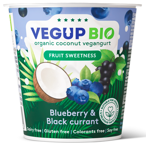napój kokosowy* 70,9 % (woda, ekstrakt z kokosa*), syrop z agawy*, jagoda* 6 %, czarna porzeczka* 6 %, skrobia*, zagęszczony sok z białych winogron*, naturalny aromat*, zagęszczony sok cytrynowy*, wegańskie kultury bakterii jogurtowych (S. thermophilus, L. delbrueckii ssp. bulgaricus) (*certyfikowany składnik ekologiczny)