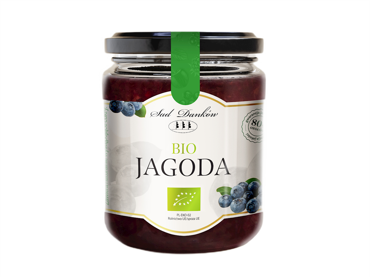 100 g produktu sporządzono z 80 g owoców. Produkt pasteryzowany otrzymany przez odszypułkowanie owoców jagód z dodatkiem koncentratu jabłkowego w celu otrzymania odpowiedniego poziomu pH