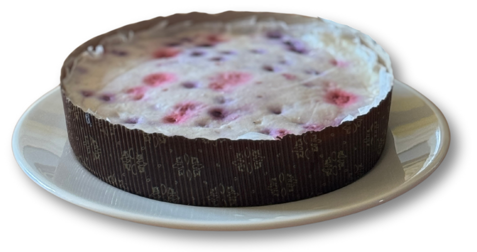 TWARÓG, ciastka pieguski (mąka gryczana, mąka jaglana, czekolada gorzka [cukier, tłuszcz kakaowy, emulgator: lecytyny (z SOI)], banan, substancja spulchniająca: wodorowęglan sodu), olej kokosowy, czekolada biała (cukier, tłuszcz kakaowy, MLEKO pełne w proszku, SERWATKA w proszku, JOGURT w proszku, emulgator: lecytyny z (SOI), aromat), SER mascarpone, owoce leśne, substancja żelująca: agar.