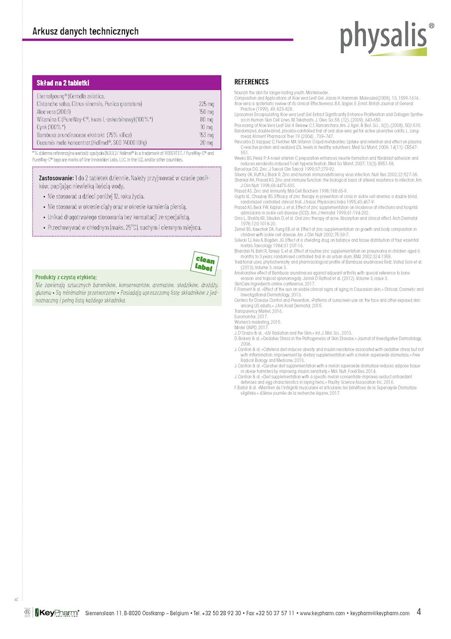 Wąkrota azjatycka przyczynia się do dobrego krążenia krwi w skórze. Ponadto Physalis Perfect Skin zawiera witaminę C (PureWay-C®), która wspomaga prawidłową syntezę kolagenu. Witamina C, cynk i aloes dodatkowo przyczyniają się do ochrony komórek przed wolnymi rodnikami. Na koniec, kompleks ten zawiera również Holimel®, SOD (dysmutazę ponadtlenkową) pochodzącą z koncentratu francuskiego gatunku melona (Cucumis melo) i krzem roślinny pochodzący z bambusa. Nie należy przekraczać zalecanej porcji do spożycia w ciągu dnia. Suplement diety nie może być stosowany jako substytut zróżnicowanej diety i zdrowego trybu życia.